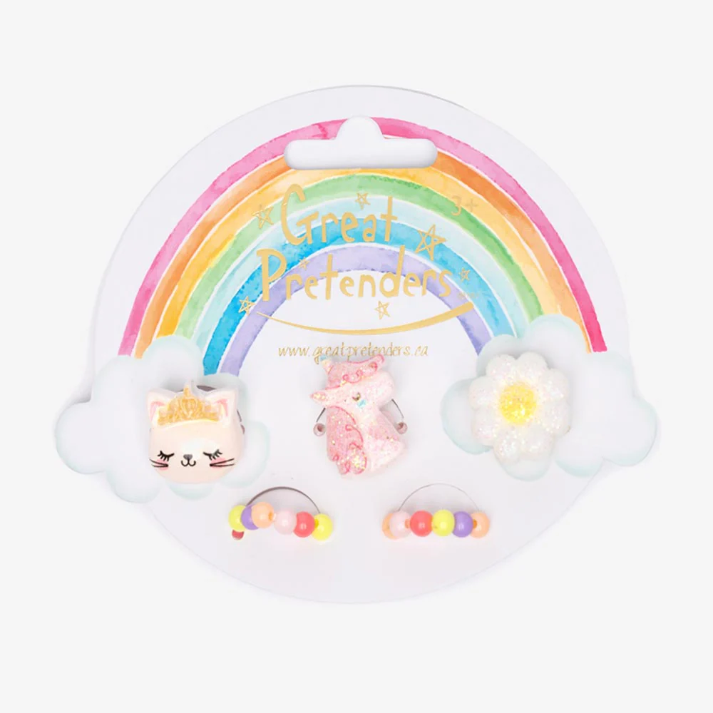 5 bagues licorne, chat, fleur et élastiques