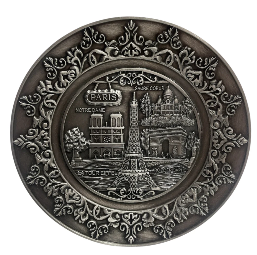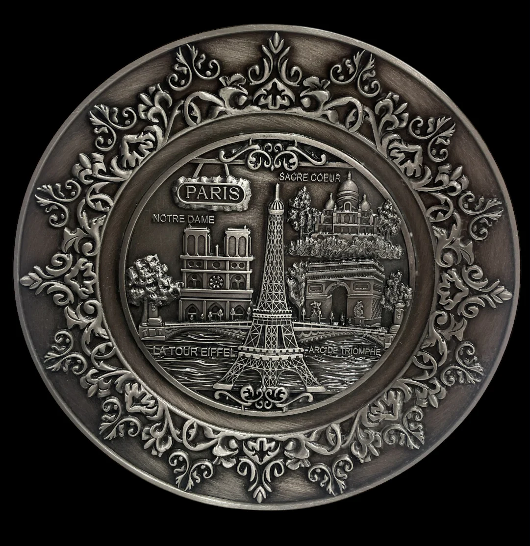 Apportez une touche élégante et nostalgique à votre décoration avec cette magnifique assiette souvenir de Paris. Fabriquée en métal de qualité supérieure avec une finition vieil argent, elle met en valeur les plus célèbres monuments parisiens en relief 2D : une véritable œuvre d’art à exposer fièrement.