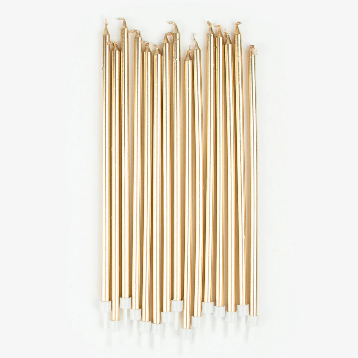 16 bougies dorées très longues et très fines, dessinées par Meri Meri, qui s’accordent à tous vos thèmes de fête. A disposer pour apporter la touche finale à un gâteau d’anniversaire ou une pièce montée. Vous pouvez les utiliser pour une fête sur le thème des princesses ou pour une soirée Gatsby chic.