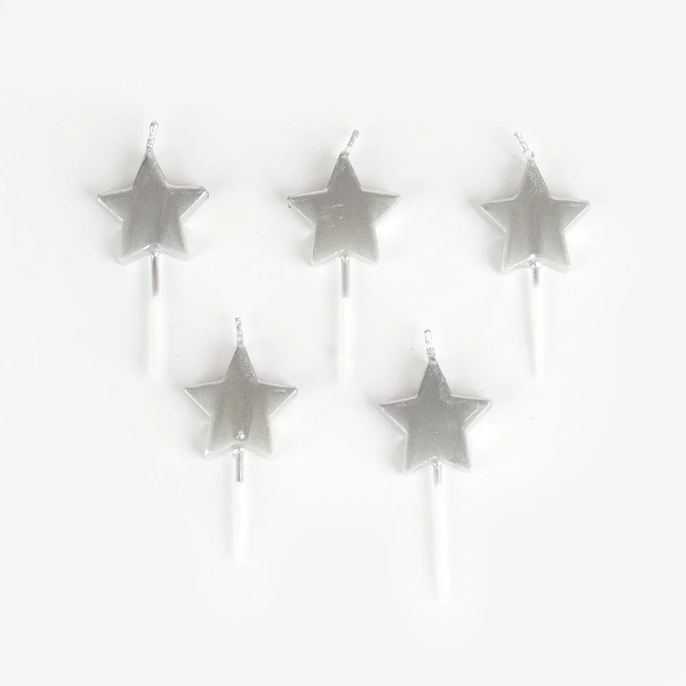 5 bougies en forme d’étoiles argentées à disposer sur un gâteau pour fêter un anniversaire d’astronaute ou de super star. Vous pouvez aussi les utiliser pour un photobooth la tête dans les étoiles !