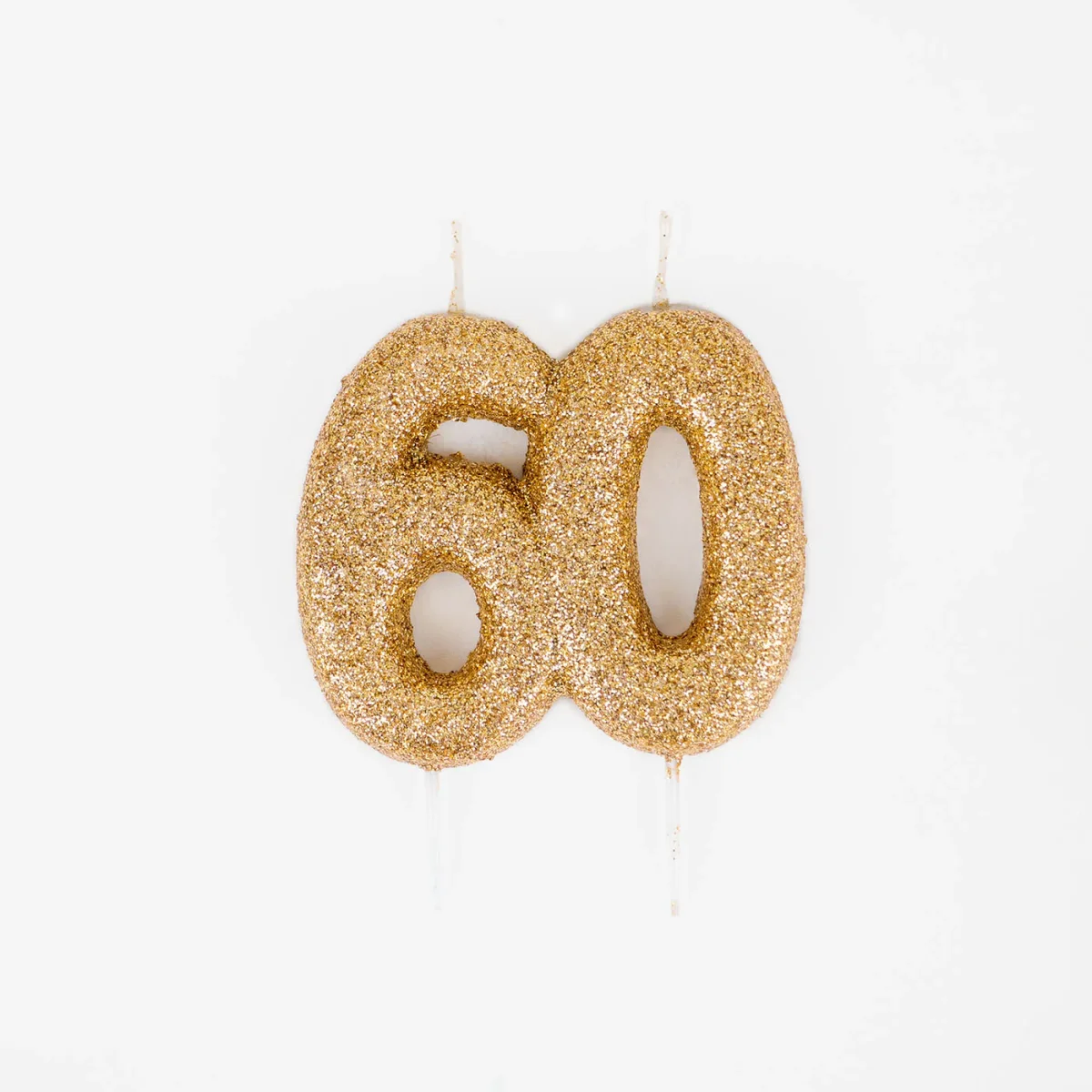 Une bougie « 60 » ans dorée et pailletée chiffre à disposer sur un gâteau pour une fête d’anniversaire étincelante! Ces bougies plairont aussi bien aux petits qu’aux grands !