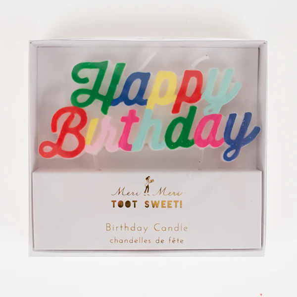Une bougie « Happy Birthday » multicolore, dessinée par Meri Meri, à disposer sur votre gâteau d’anniversaire pour une fête inoubliable !