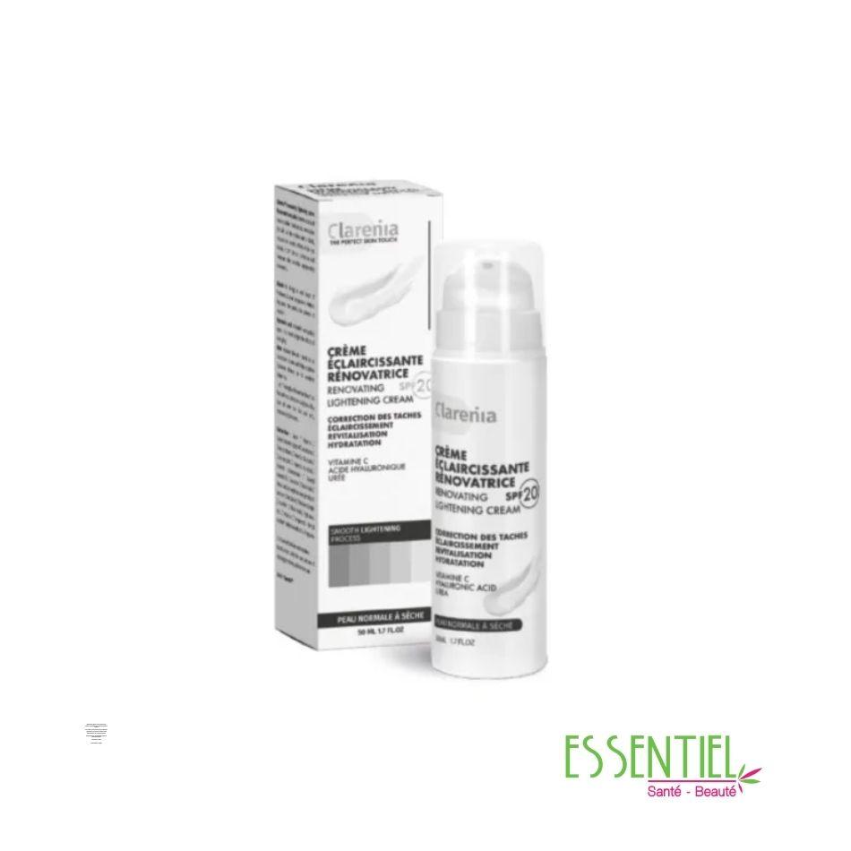 La crème éclaircissante rénovatrice peau normale a sèche de la marque Clarenia™ permet de corriger les tâches et prévenir leur répartition, d’hydrater la peau en surface et en profondeur, réduire les effets néfastes des UV grâce à une protection solaire SPF 20 et augmenter les bénéfices des traitements dépigmentants grâce à l’association d’actifs efficaces :