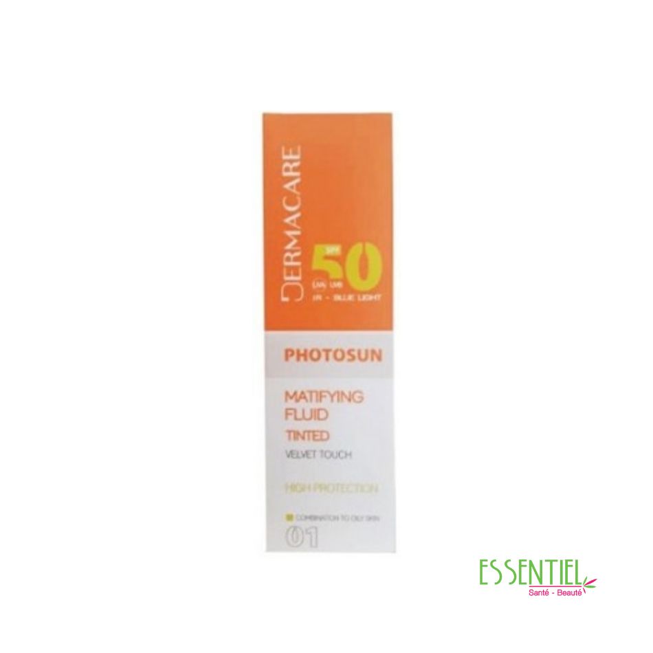 Le Fluide Solaire DERMACARE PHOTOSUN matifiant et teinté a haute protection spf 50 qui protége la peau des uva/uvb te des infrarouges. il protege et hydrate illumine unifie le teint et donne un effet bonne mine avec un toucher sec