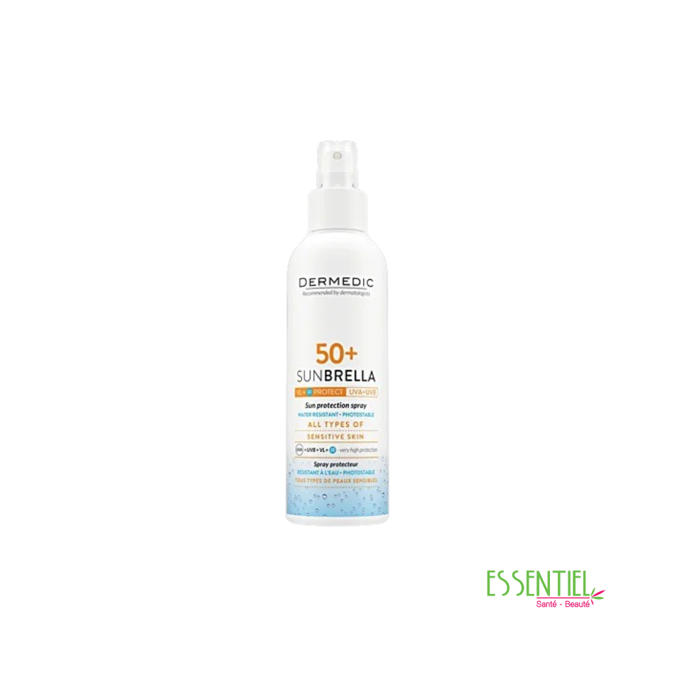 Le Dermedic Sunbrella Spray SPF 50+ offre une protection très élevée contre les rayons UVA, UVB, lumière visible (VL) et infrarouge (IR), adaptée à tous les types de peaux sensibles Sa formule innovante contient :