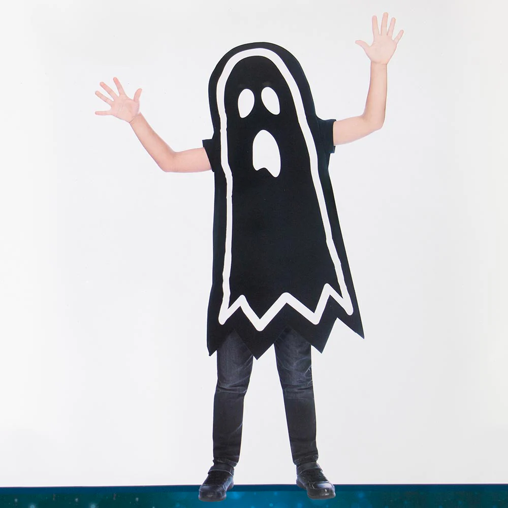Ce deguisement fantome pour enfant convient pour une taille 4-6 ans. Il se compose d’une tunique noire avec détails blancs et se met à briller dans le noir. Ce déguisement de fantôme phosphorescent est idéal pour Halloween !