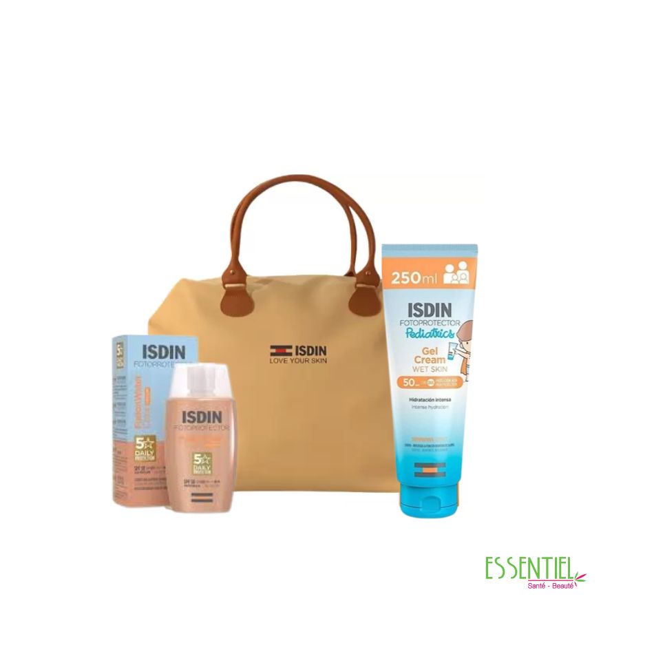 ISDIN pack famille gel crème pediatrics SPF 50+ 250ML+ecran solaire fusion water teinté medium spf 50+ +sac de plage (offert)