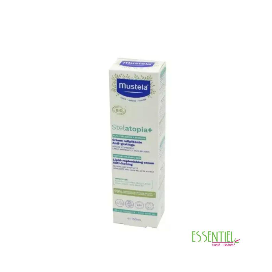 La crème relipidante anti-grattage Mustela Stelatopia+ Bio 150 ml est spécialement conçue pour les peaux très sèches à atopiques. Elle répare et protège la peau, offrant un soulagement immédiat et prévenant les récidives :