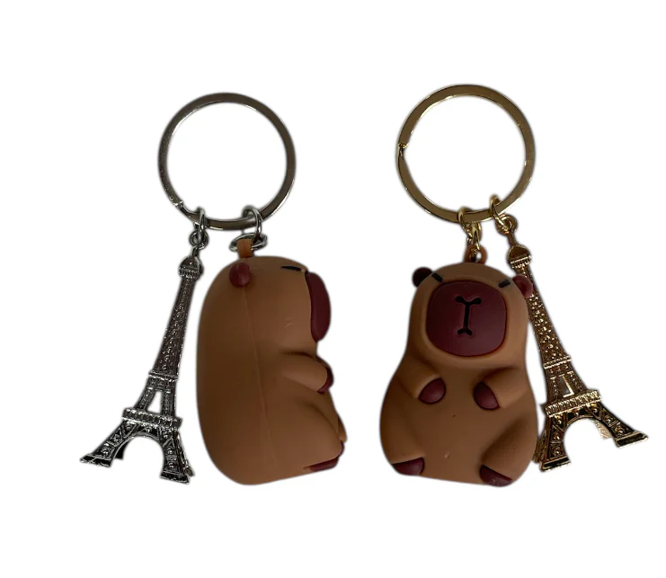 Découvrez le porte-clés qui allie mignonnerie 🐾 et élégance ✨: un capybara en caoutchouc souple et flexible accompagnée de la célèbre Tour Eiffel en métal doré ou argenté.