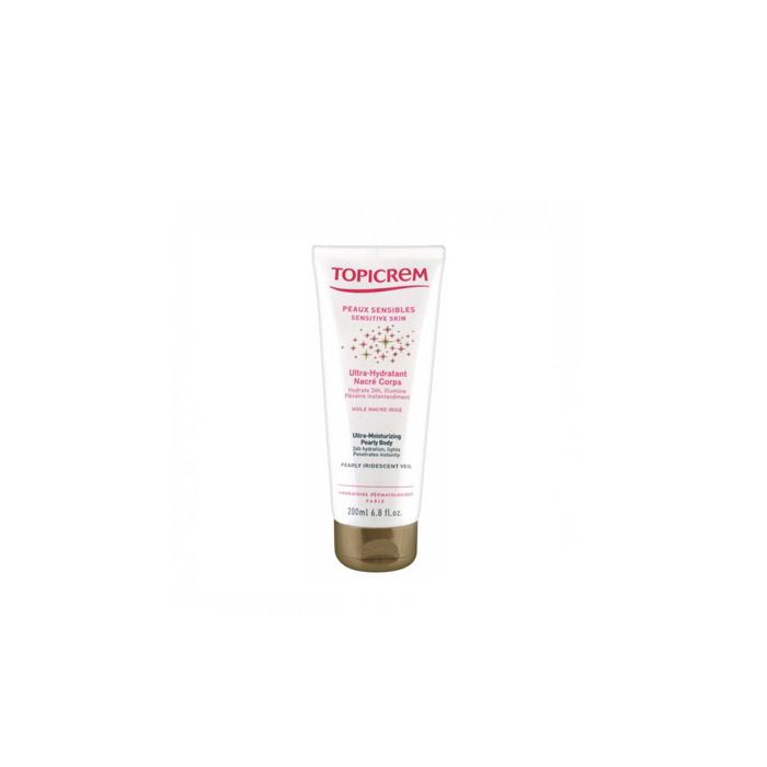 Topicrem Ultra-Hydratant Nacré sous forme d’émulsion onctueuse douce et fondante, pénètre rapidement dans la peau, pour hydrater pendant 24 heures et illuminer.