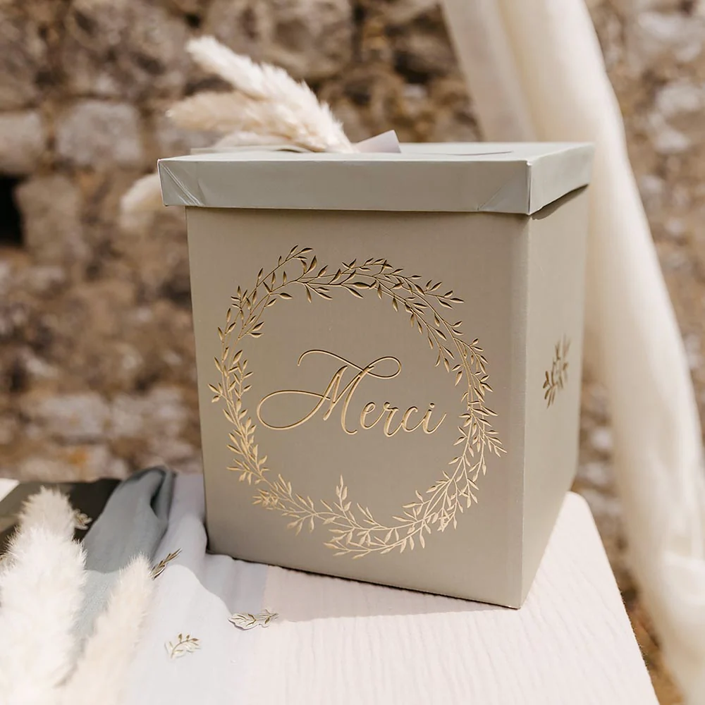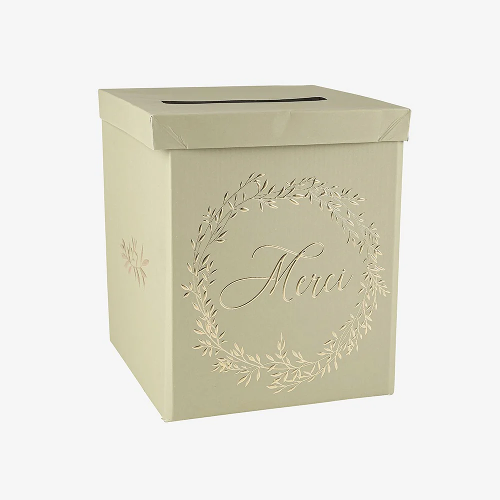 Cette urne de mariage sauge s’intégrera à merveille dans une déco mariage bohème ou botanique, anniversaire ou bapteme. Elle est ornée de petites brindilles et de l’inscription « merci » en doré. Vos invités pourront y glisser enveloppes et petits mots de félicitations à l’occasion de votre mariage ou de votre évènement. Cette urne vous permettra aussi de compléter votre decoration de table !