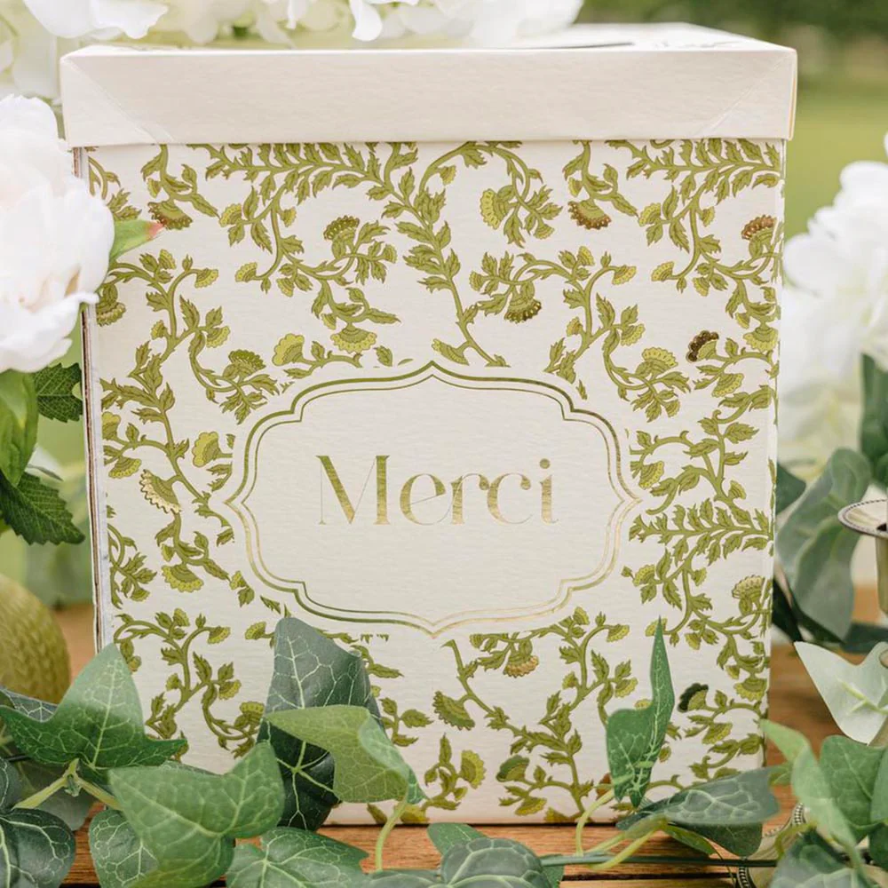Cette urne de mariage sauge s’intégrera à merveille dans une déco mariage bohème ou botanique, anniversaire ou baptême. Elle est ornée de petites brindilles et de l’inscription « merci » en doré. Vos invités pourront y glisser enveloppes et petits mots de félicitations à l’occasion de votre mariage ou de votre évènement. Cette urne vous permettra aussi de compléter votre décoration de table !