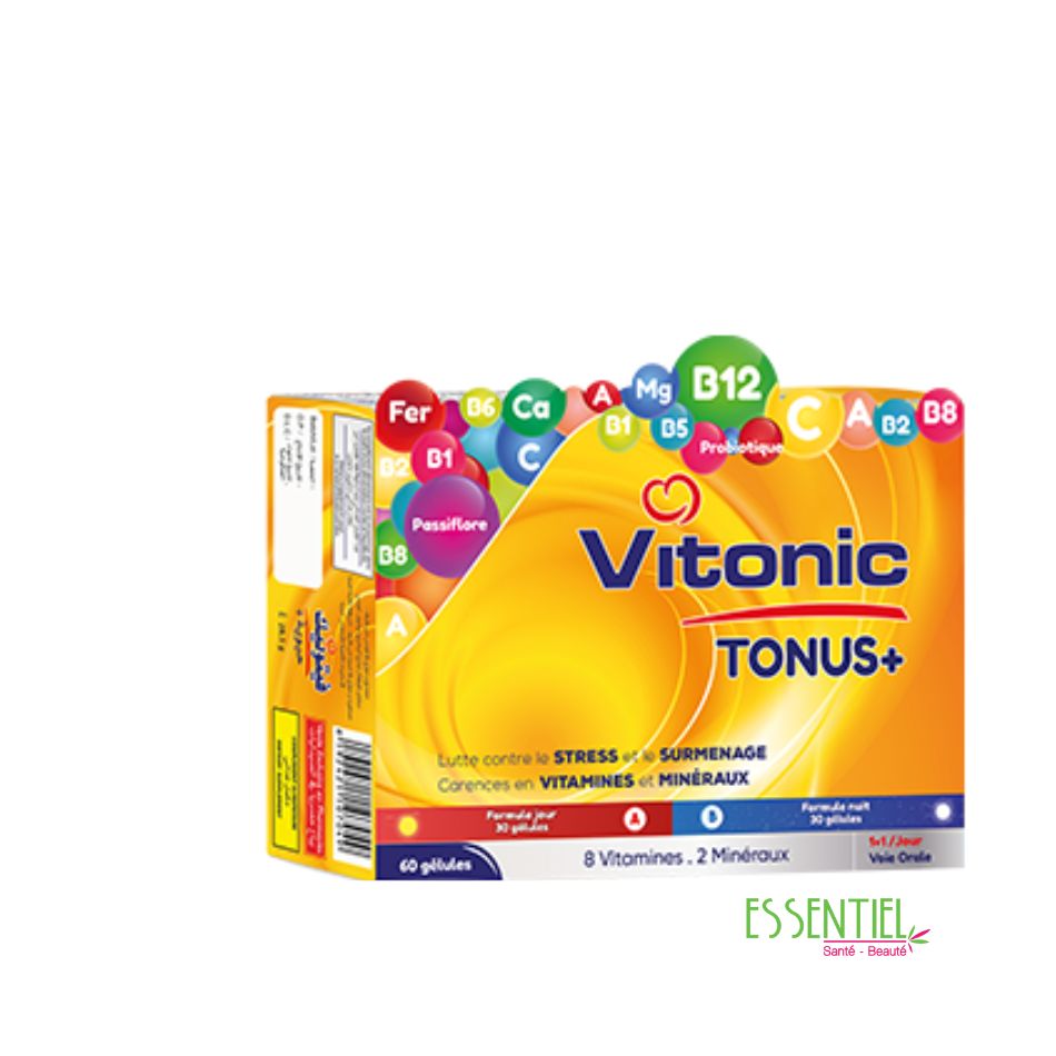 VITONIC TONUS + contribue au bien-être et à la vitalité, augmente le tonus physique et intellectuel, pallie les carences en vitamines, aide en période de surmenage, diminue le stress et améliore la qualité du sommeil, états fébriles , renforce les défenses naturelles et limmunité.